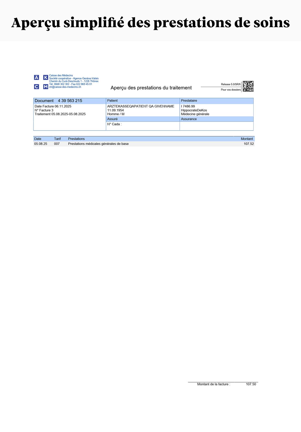 - Un aperçu simplifié des prestations de soins qui ont été délivrées. Il permet de vérifier plus simplement les informations essentielles concernant vos consultations et traitements. En cas de doute, n’hésitez pas contacter votre médecin.