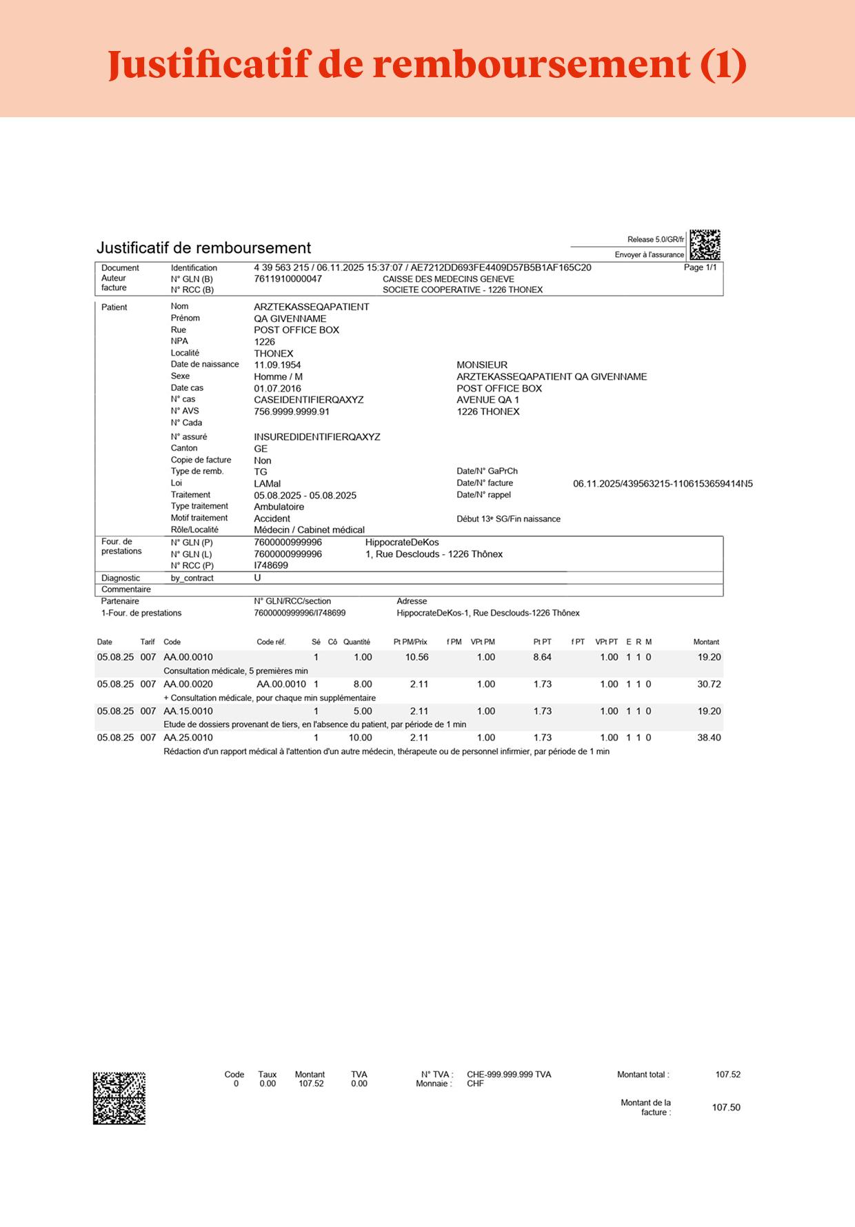 - Une page avec des QR-codes. Ces codes contiennent toutes les informations nécessaires à la gestion de votre facture par votre assureur-maladie.